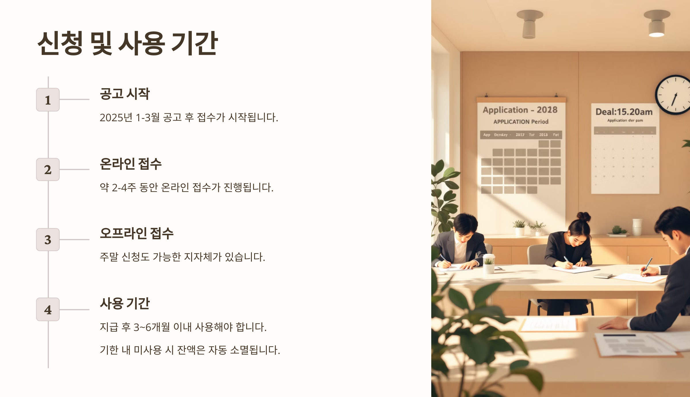 📌 온라인·오프라인 신청 가능하며, 지급 후 3~6개월 내 사용 필수