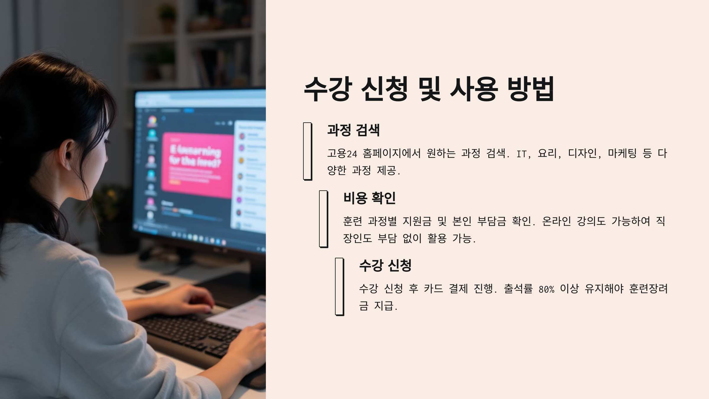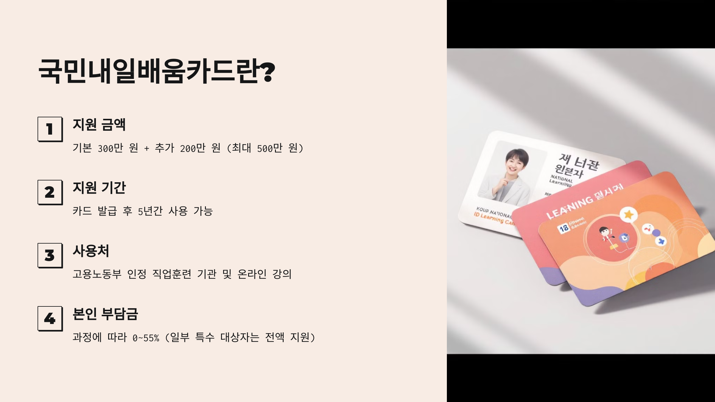 ✔ 본인 부담금: 과정에 따라 0~55% (일부 특수 대상자는 전액 지원)