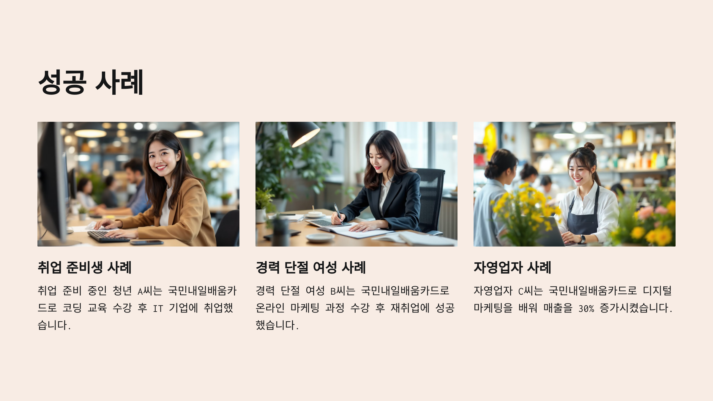 경력 단절 여성 B씨 – 국민내일배움카드로 온라인 마케팅 과정 수강 후 재취업