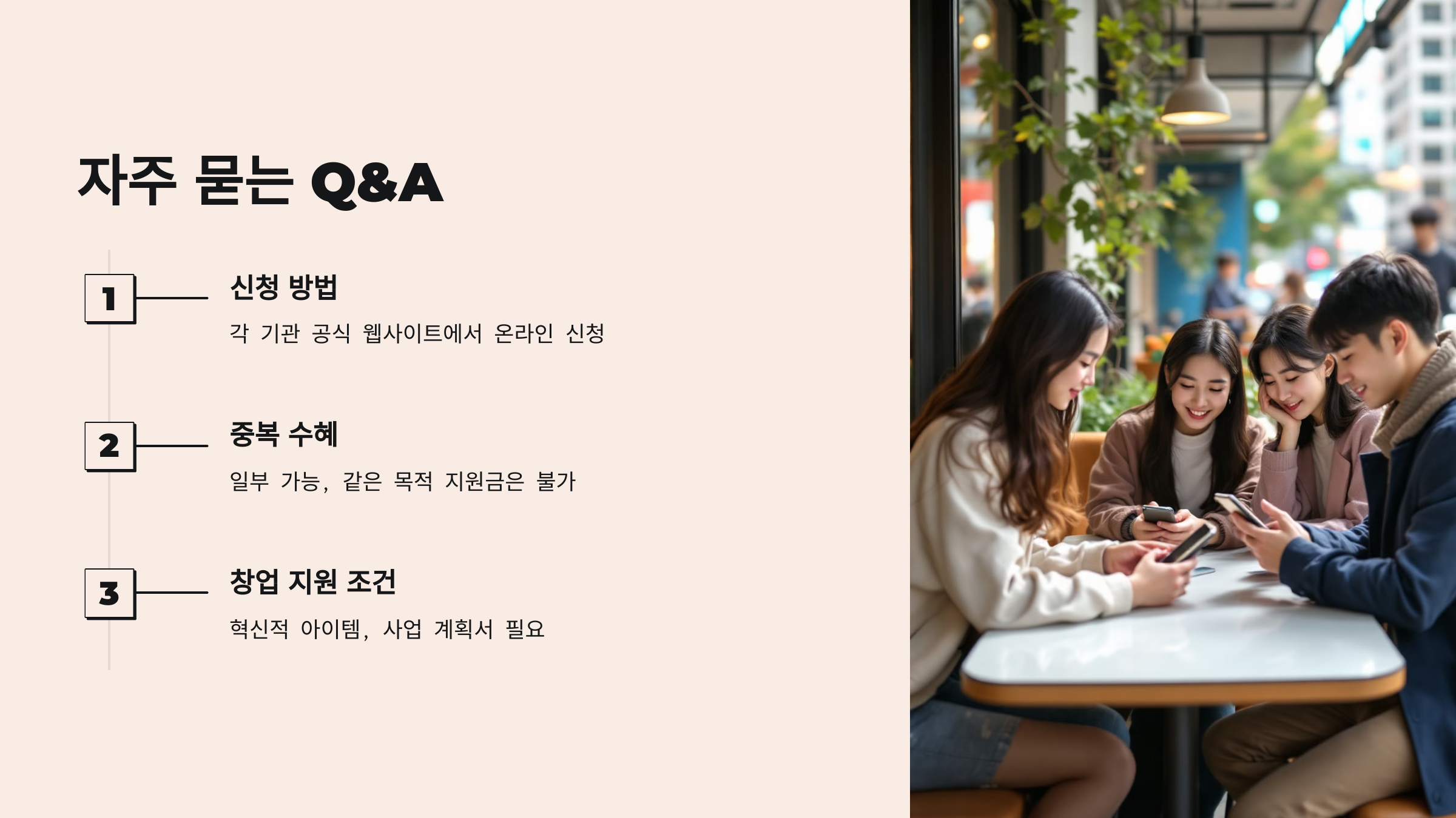 청년 창업자라면 창업 자금 지원을, 취업 준비생이라면 직업 훈련 및 지원금을 통해 경제적 부담을 덜고, 더 나은 미래를 준비할 수 있습니다.