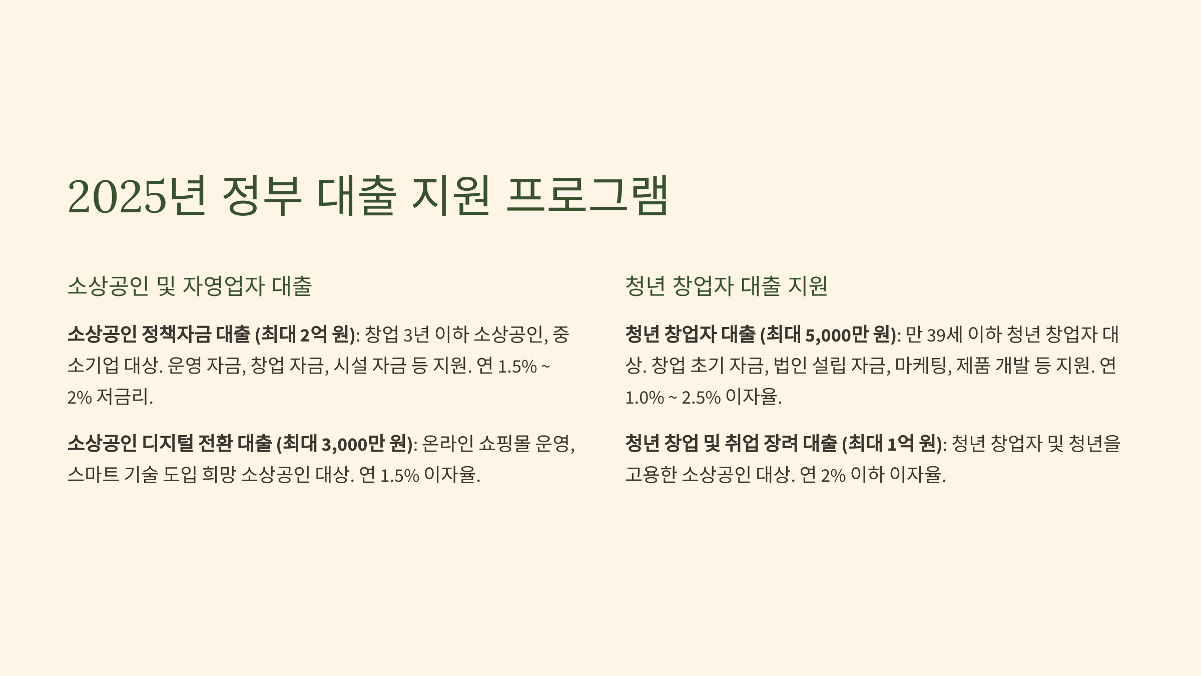 2025년, 정부는 소상공인, 창업자, 청년, 자영업자 등을 위한 다양한 대출 지원 프로그램을 제공하고 있습니다.
