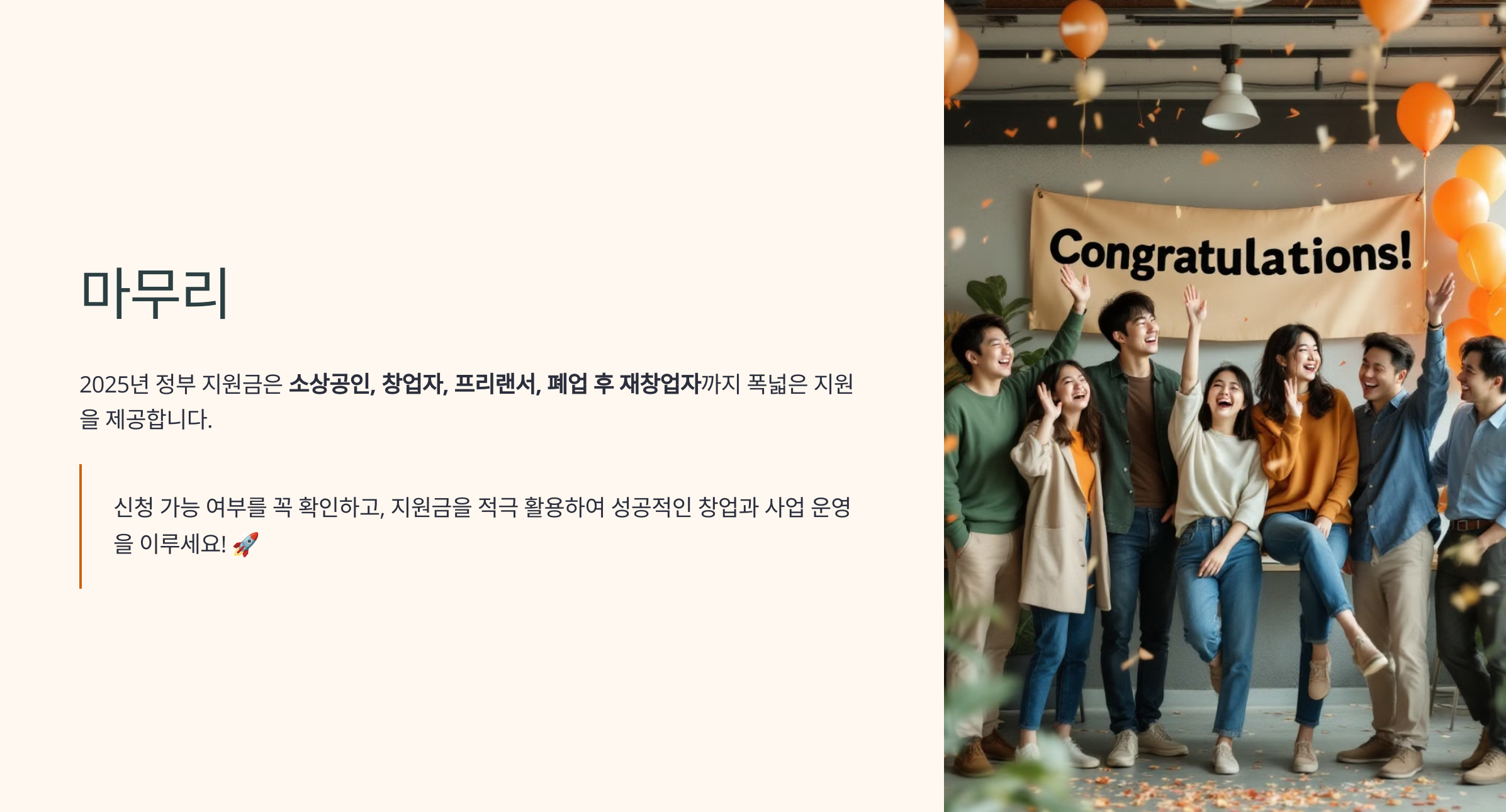 2025년 정부 지원금은 소상공인, 창업자, 프리랜서, 폐업 후 재창업자까지 폭넓은 지원을 제공합니다.