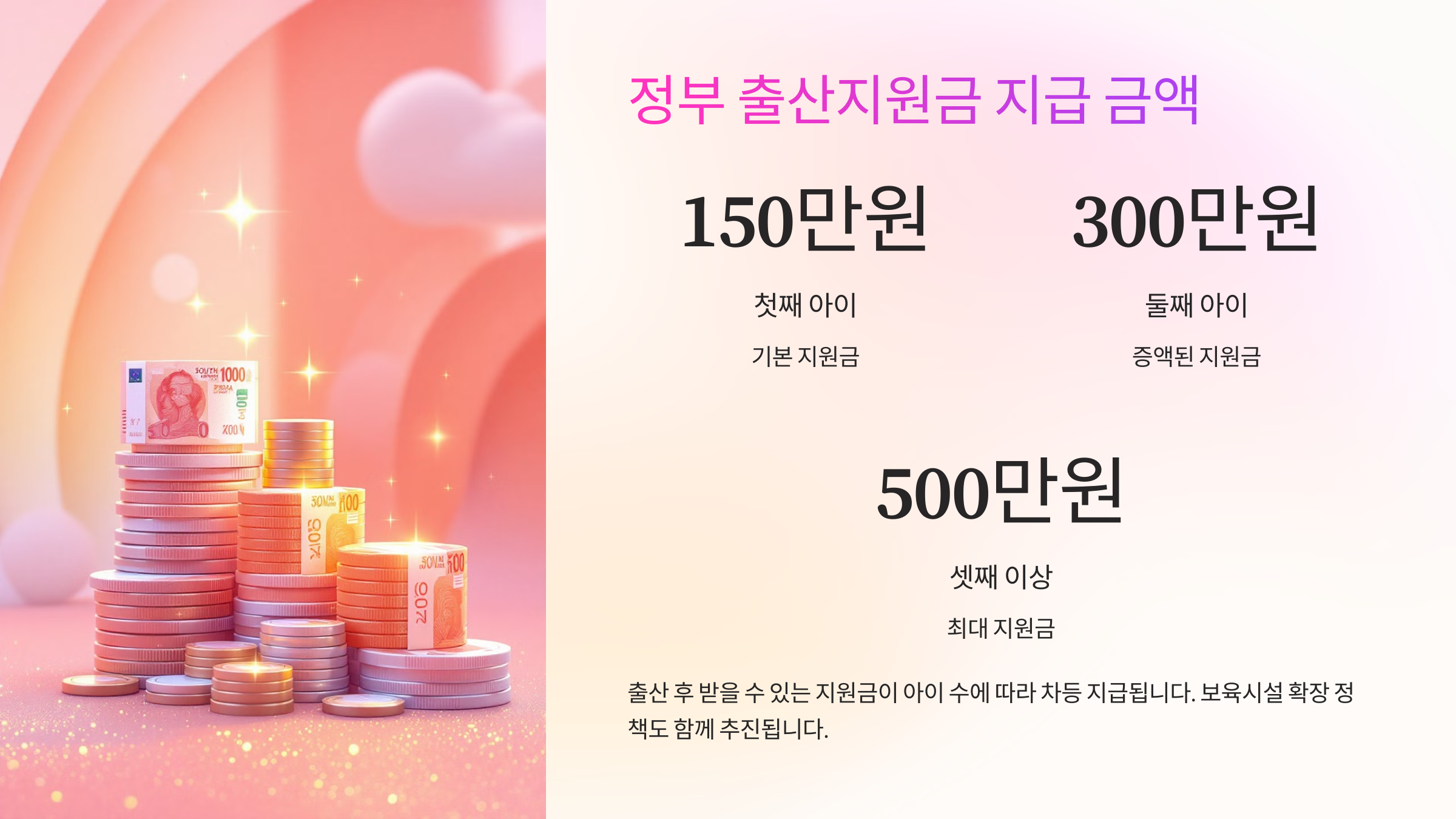 첫째 아이부터 지원금이 지급되며, 둘째, 셋째 이상 출산 가정에는 추가 지원금이 제공될 예정입니다.