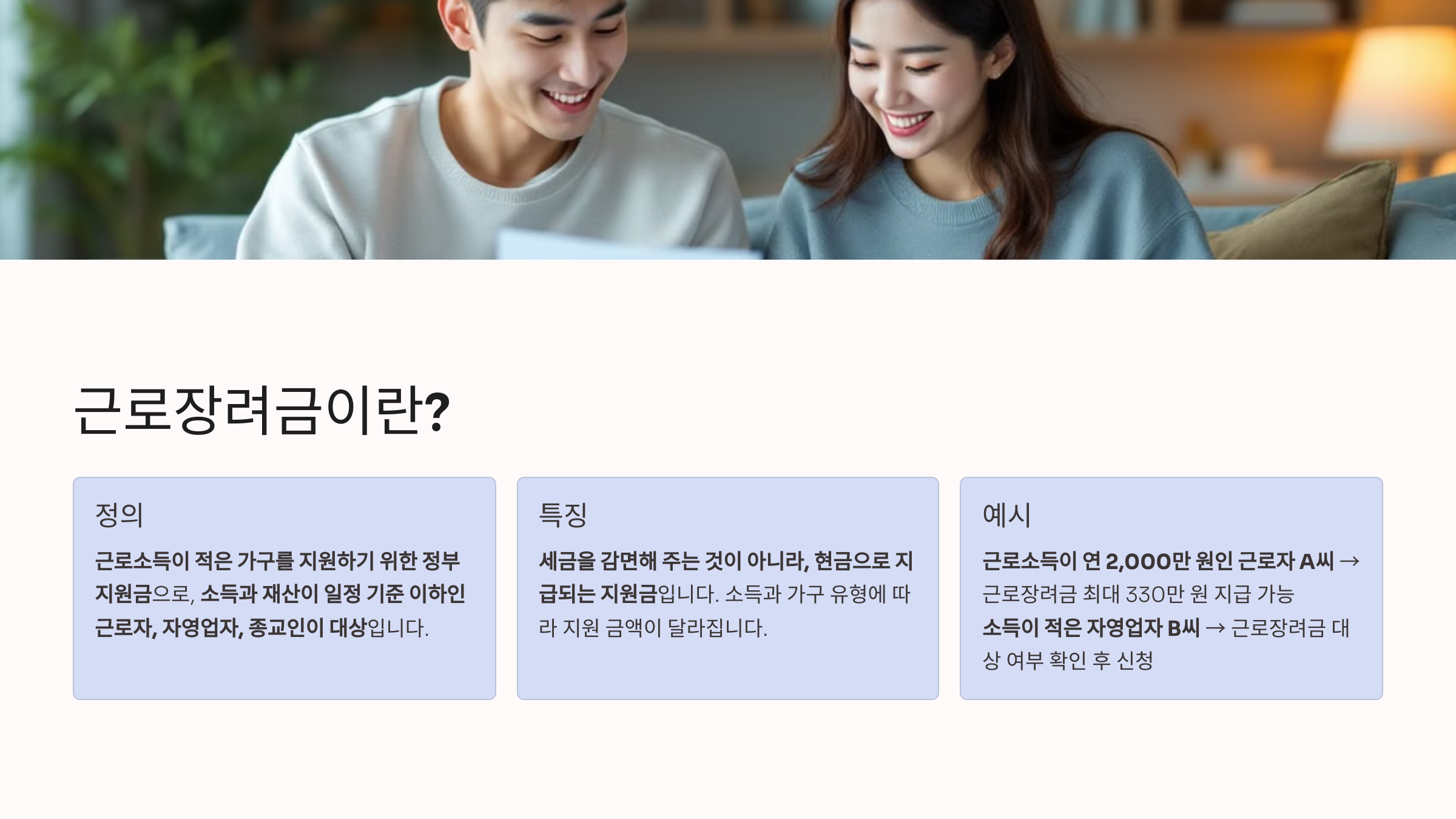 ✔ 근로소득이 연 2,000만 원인 근로자 A씨 → 근로장려금 최대 330만 원 지급 가능
